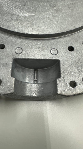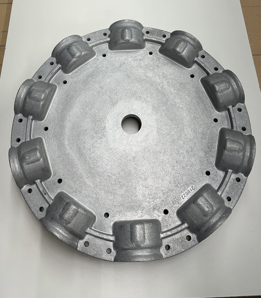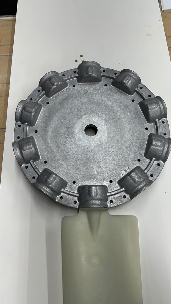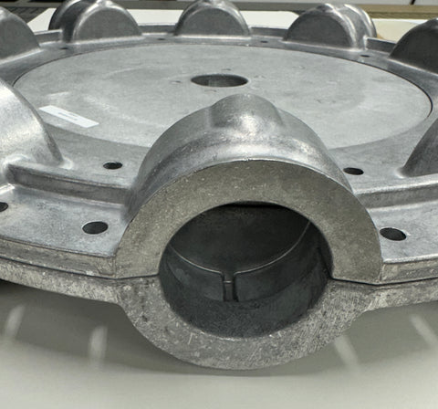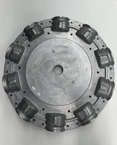 This is a 10 blade Multiwing W hub and retaining flange made of aluminum. It has a small pilot hole but is intended to be machined to meet customer requirements. We have a machine shop to bore your center hole and drill the bolt pattern, typically in 24 hours.