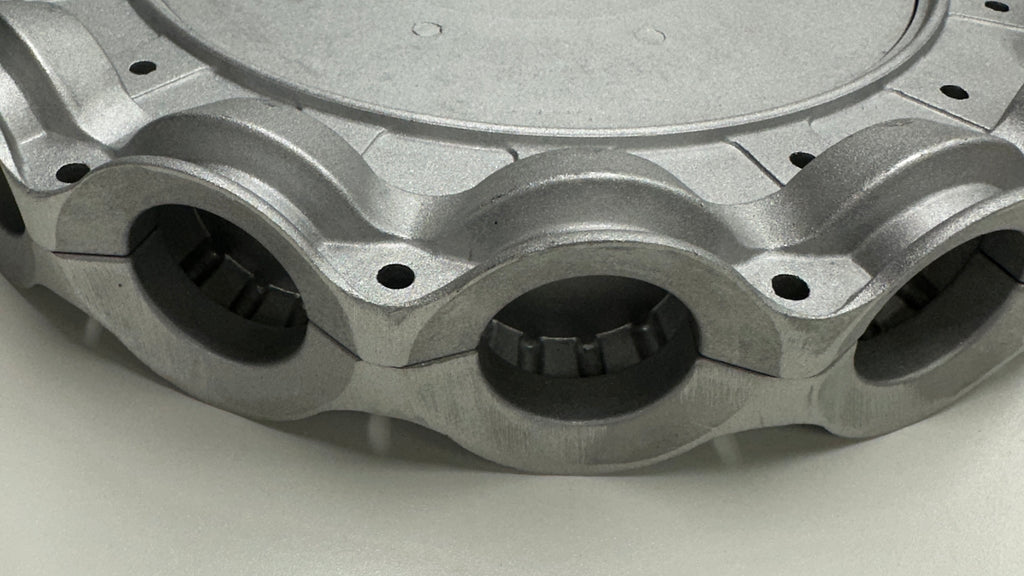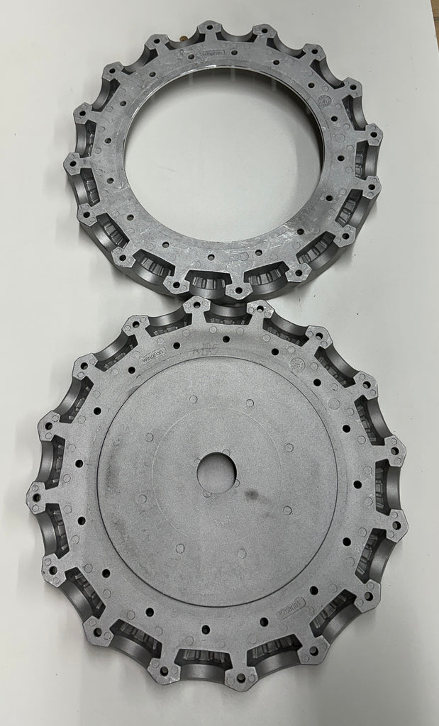 This is a 16 blade Wingfan Z hub and retaining flange made of aluminum. It has a small pilot hole but is intended to be machined to meet customer requirements. This can be used interchangeably with Multiwing blades. We have a machine shop to bore your center hole and drill the bolt pattern, typically in 24 hours.